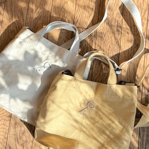 コットン素材でナチュラルな雰囲気のミニバッグ。長さ調節ができるショルダーストラップ(※取り外し可)で、斜めがけスタイルもOKです! 日常的に使いやすい2色を選びました。思い出のハート型ペンダント♡を刺繍で入れました